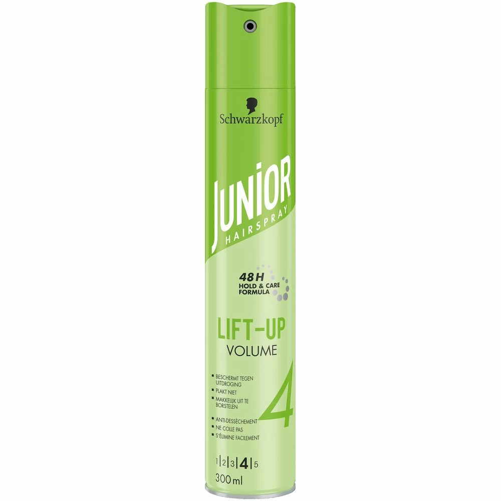 Junior Haarspray 3 in 1 Lift Up VolumeJunior Hairspray Lift-Up Volume geeft het haar een directe volume boost.Junior Hairspray Lift-Up Volume geeft het haar een directe volume boost. De speciale 48 uur Hold & Care formule biedt perfecte fixatie gedurende de hele dag en optimale bescherming voor het haar. De micro-verstuiver zorgt voor micro-fijne verstuiving en een gelijkmatige verdeling over het haar. Beschermt het haar tegen uitdrogen, plakt niet en is makkelijk uit te borstelen.48u Hold &